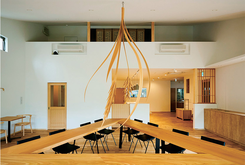 左:ビルが建つ際に伐採(cǎi)せざるを得なかったケヤキの木材を使って、エントランスにオブジェ「承継」をつくりました