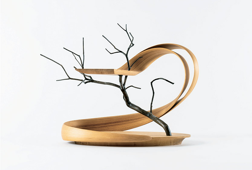 自然の木の枝ぶりと人工的な曲線の対比が美しい飾り棚「渦紋IV」
