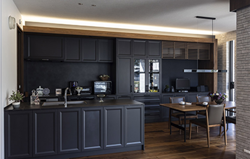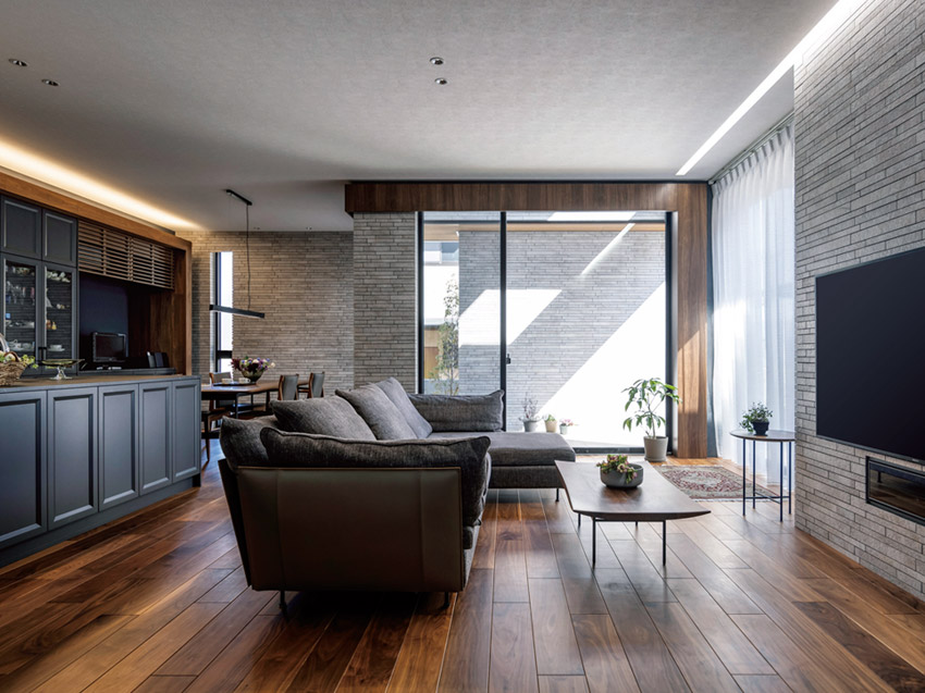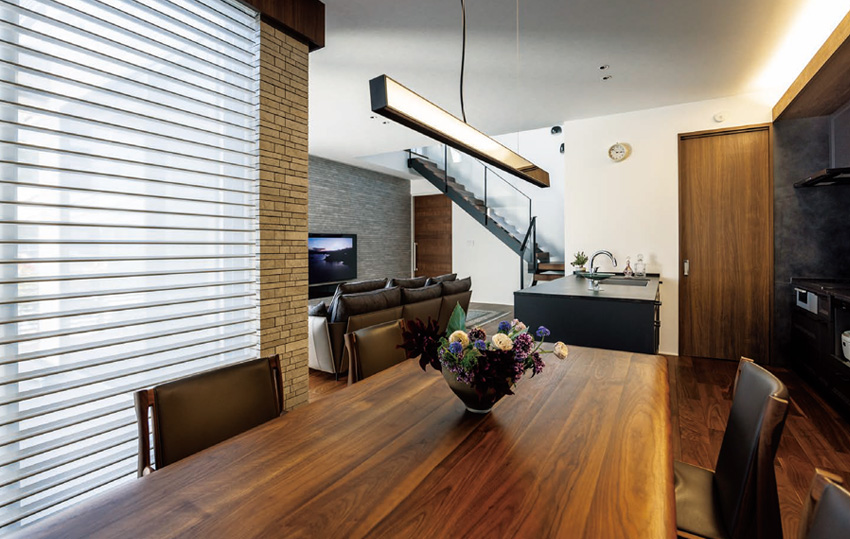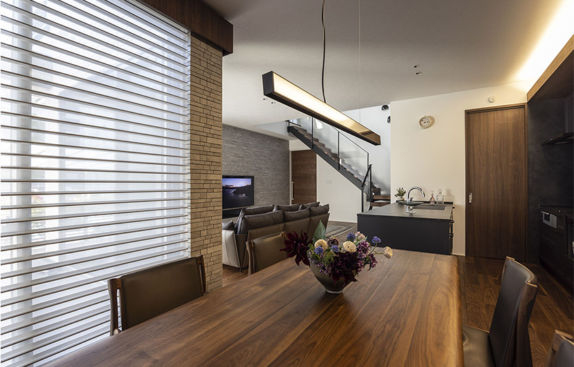 リビングの窓やキッチンの背面収納を囲むようにウォルナット材の「ハーフゲート」をデザイン。空間を引き締める効果があります