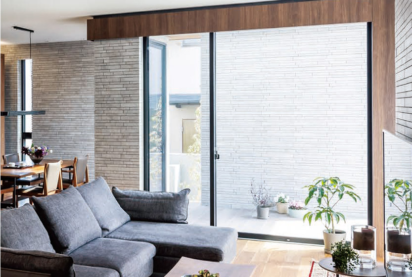 テラスに設(shè)置した目隠し用の壁と同じ素材を、リビングダイニングのアクセント壁にも使用