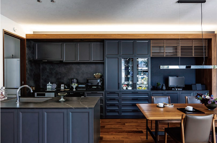 深みのあるグレーが印象的なキッチンはフルオーダーで製作。空間全體に光をもたらす間接照明をハーフゲートに入れ込み、料理をする手元にも十分な明るさを確保しています。碧さんは、大畫面のテレビで好きなコンテンツを観ながら調(diào)理する時間が楽しく、つい料理を作りすぎてしまうのだとか。