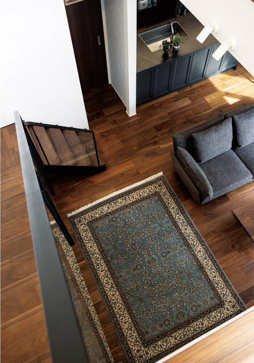 トルコで手に入れた思い出のラグを、階段や2階のホールから眺めるのが碧さんの楽しみの一つ