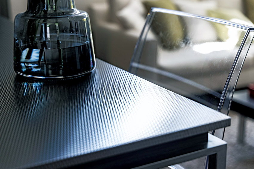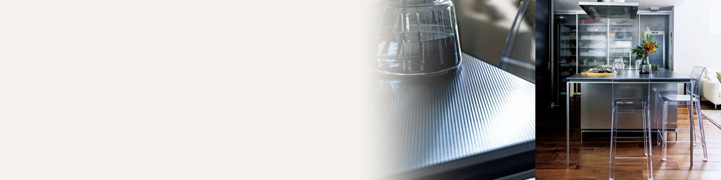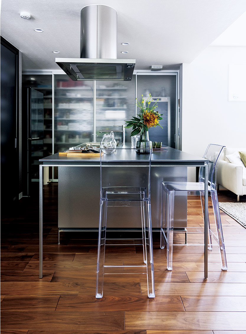 眺望が主役の住まいに映える、シンプルでフォルムの美しいキッチンをセレクトされたTさま。オールステンレスで直線的なラインが印象的なデザインはトーヨーキッチンのもの。ワークトップにはテクスチャー加工が施され、インテリア性を高めています。ショールームで見かけたイタリアの家具ブランド、カルテルのスツールにも一目惚れし、合わせて使用されています。