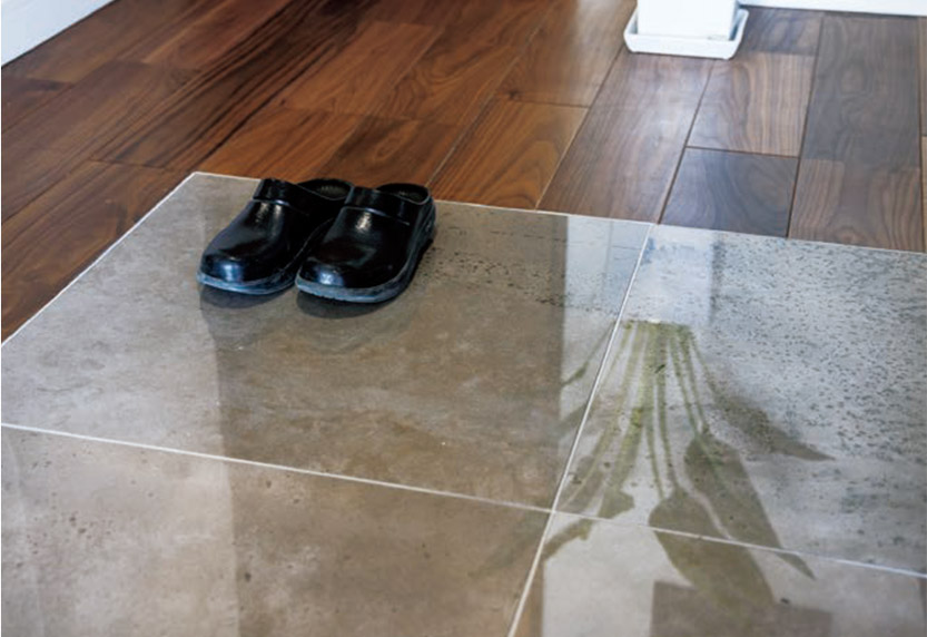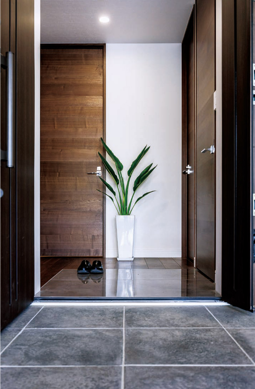 將來を見據えてバリアフリーを検討されていました。そこで、玄関は歐米の住まいをイメージしたフラットなデザインを提案。素材を切り替えて伸びやかな空間をつくりました。継ぎ目が極力目立たないように処理を工夫し、デザイン性にも優れたスペースとなっています。