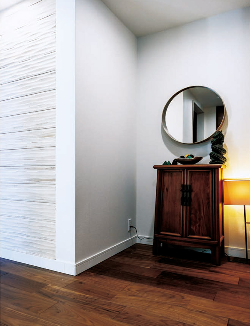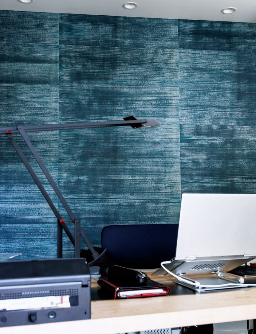 “本物”へのこだわりをおもちだったアナさまは、素材選びにも時間をかけられました。青が印象的な書斎のアクセントクロスは、淺草の和紙工房KAMISMオリジナルの製品。1枚1枚手作業で色をつけているため、場所によって表情が全く異なります。1階の玄関ホール橫には杉のアクセントウォールを採用し、溫かみのある空間を演出しています。