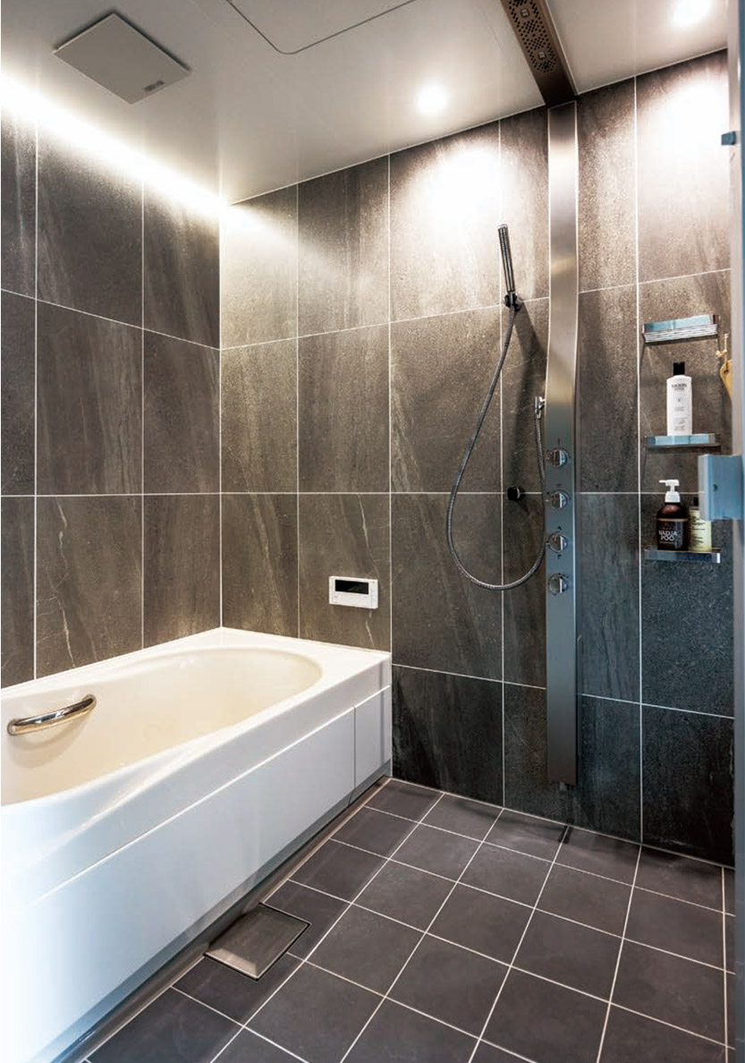 「浴室は癒やしの空間にしたい」という徹さまの願いをかなえるため、海外のバスルームを彷彿させるオーバーヘッドシャワーを採用。打たせ湯機能も付いており、間接照明のやわらかい光の中で極上のリラックスタイムを味わえるのだとか。