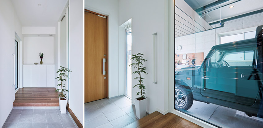 朋仁さんの強い希望で設けたビルトインガレージ。玄関ホールとFIX窓越しにつながり、愛車の姿を室內からいつでも眺めることができます。車が引き立つよう、玄関ホールは白と木目でシンプルなインテリアとしています。