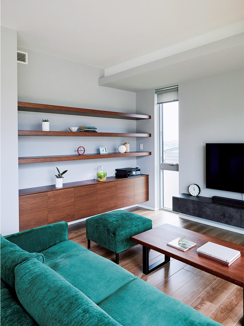Tさま邸では、彩度を落としたやさしい色づかいを心がけました。庭の緑とソファの色がリンクし、美しい風景を描いています。楽しい日常をこの家が演出していることを光栄に思います。