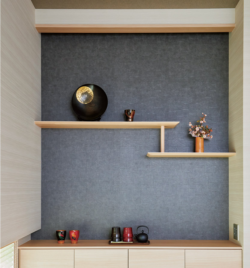 リビングの壁面には、旅の思い出や家族の寫真を飾れるオープン棚をしつらえました。和室の違い棚は間接照明やアクセントクロスで演出。佳代子さんのお母さまが手掛けたクラフト作品が飾られています。
