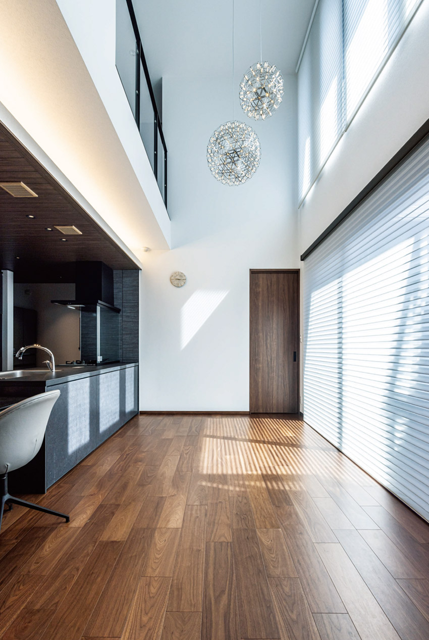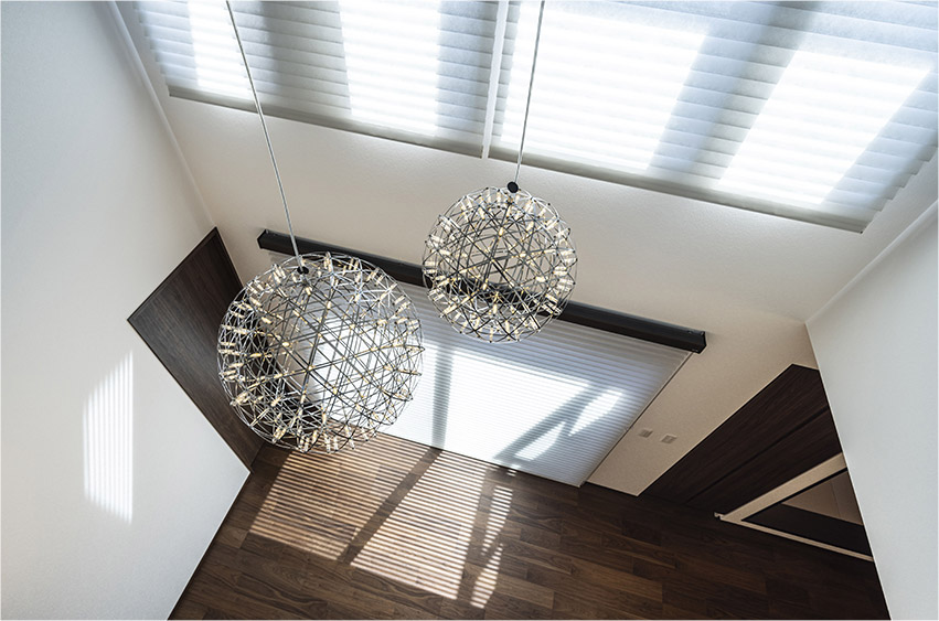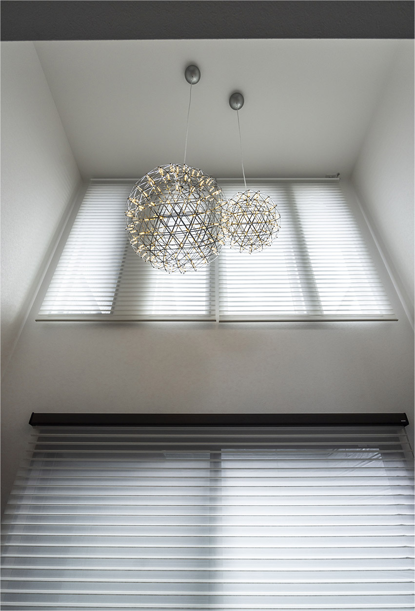 その吹き抜けの天井を飾るのは、2燈の球形のシャンデリア。ブラインド越しに訪れる自然光やキッチン側(cè)の間接照明と相まって空間を華やかに彩っています?!袱长握彰鳏颔辚鹰螗皞?cè)(寫(xiě)真手前)から見(jiàn)るのが好きなんです」と夫の雅能(まさよし)さん。ご夫妻自身が惚れ込んで選んだデザインを、満足そうに眺めていらっしゃいます。