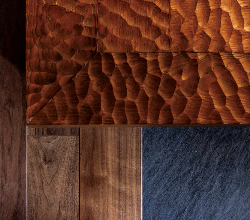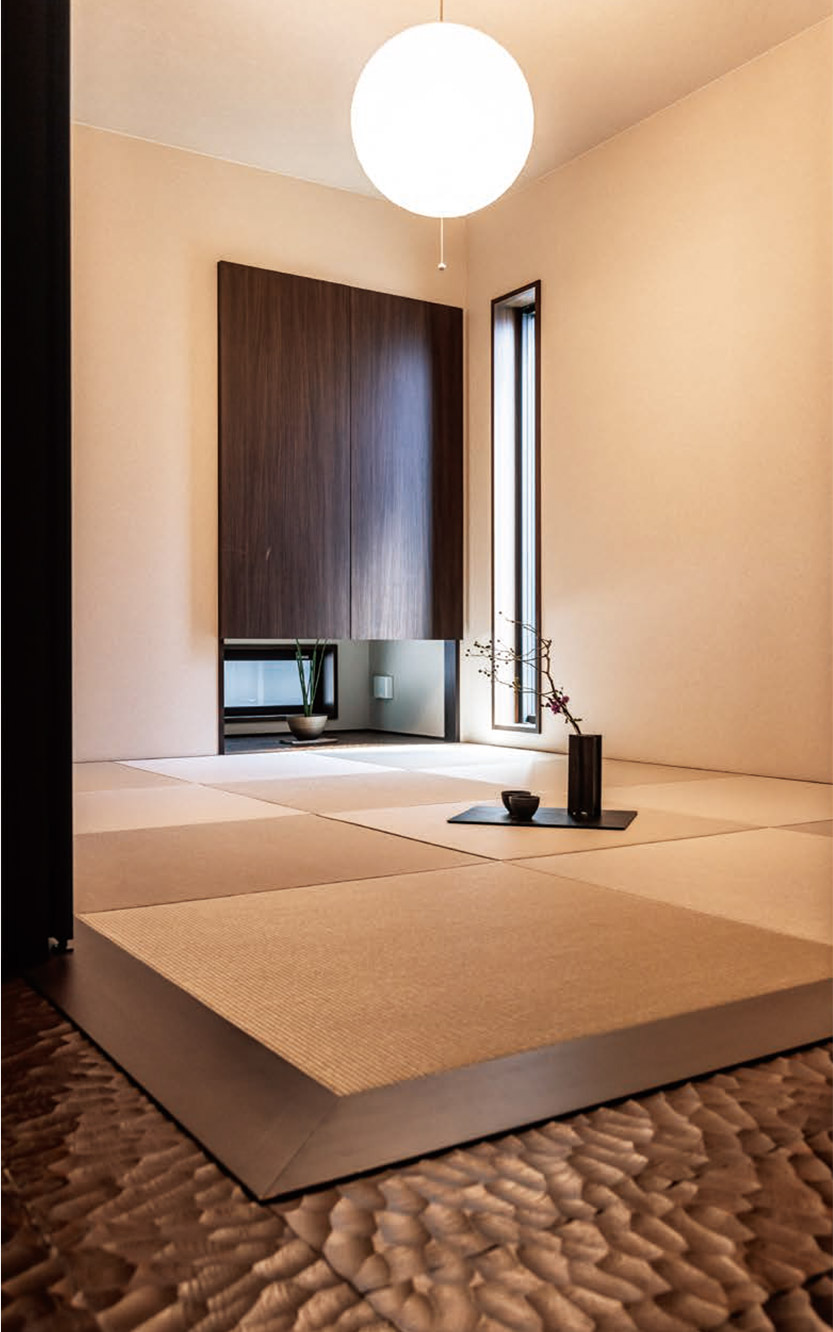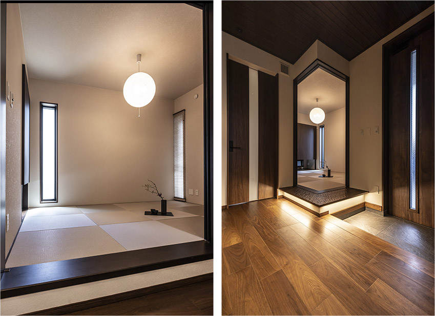 玄関ホールとリビングから出入りできる和室。玄関側(cè)には質(zhì)感豊かなスプーンカットの床板が用いられています