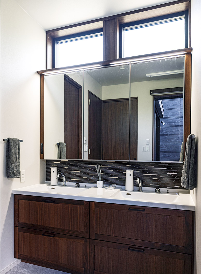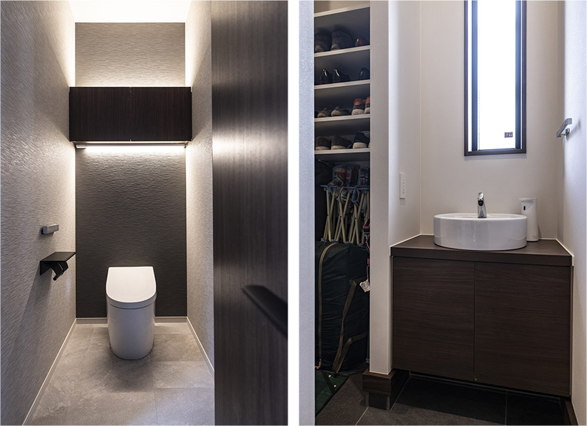 Aさま邸は水まわりにもきめ細(xì)かなこだわりが光ります。子どもたちのトイレトレーニングをサポートするため、トイレは広めに設(shè)計(jì)。間接照明の柔らかい光を組み合わせた心地良い空間です。また、玄関収納の橫には手洗いカウンターを設(shè)置。外から帰ったらすぐ手を洗う衛(wèi)生習(xí)慣が身につきます。