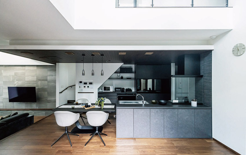 Aさま邸を象徴するダイニングの吹き抜け空間。全館空調(diào)を採(cǎi)用しているので、吹き抜けを多用した間取りでも、すみずみまで快適さが行き屆いています
