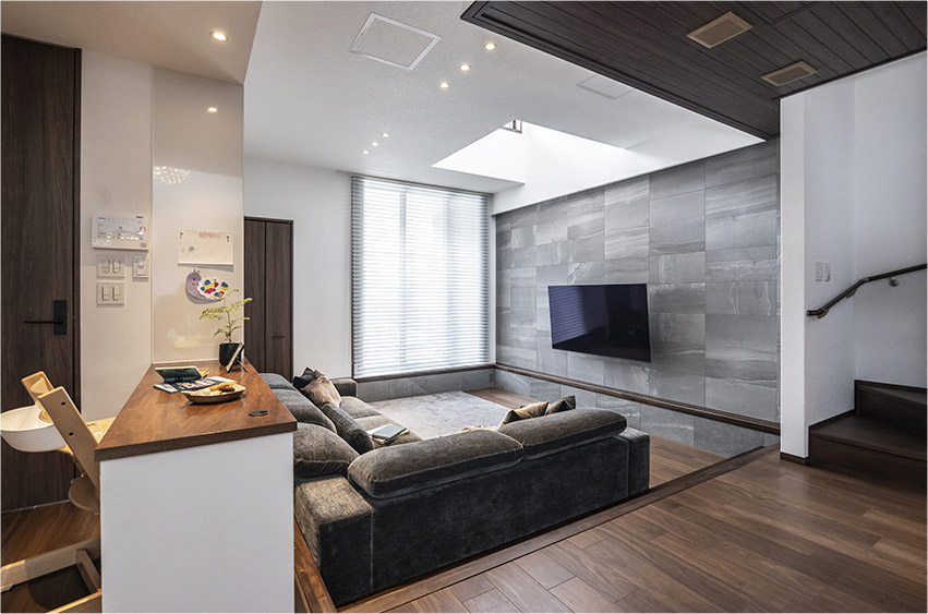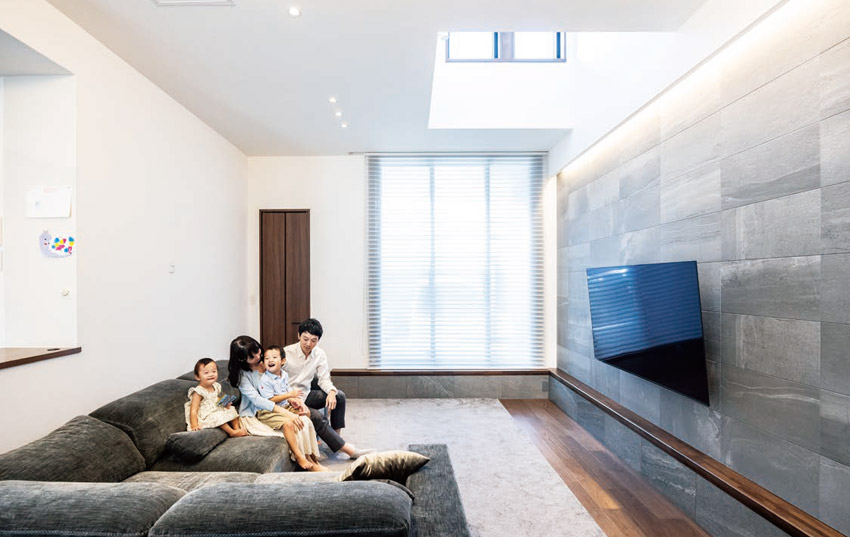 リビングでにぎやかに過(guò)ごすご家族。テレビは壁掛けにしてすっきりと