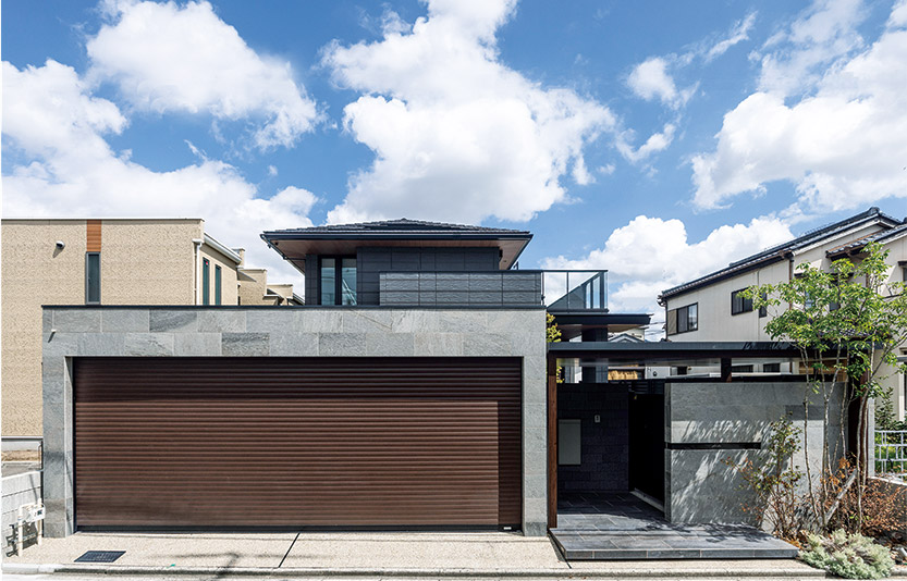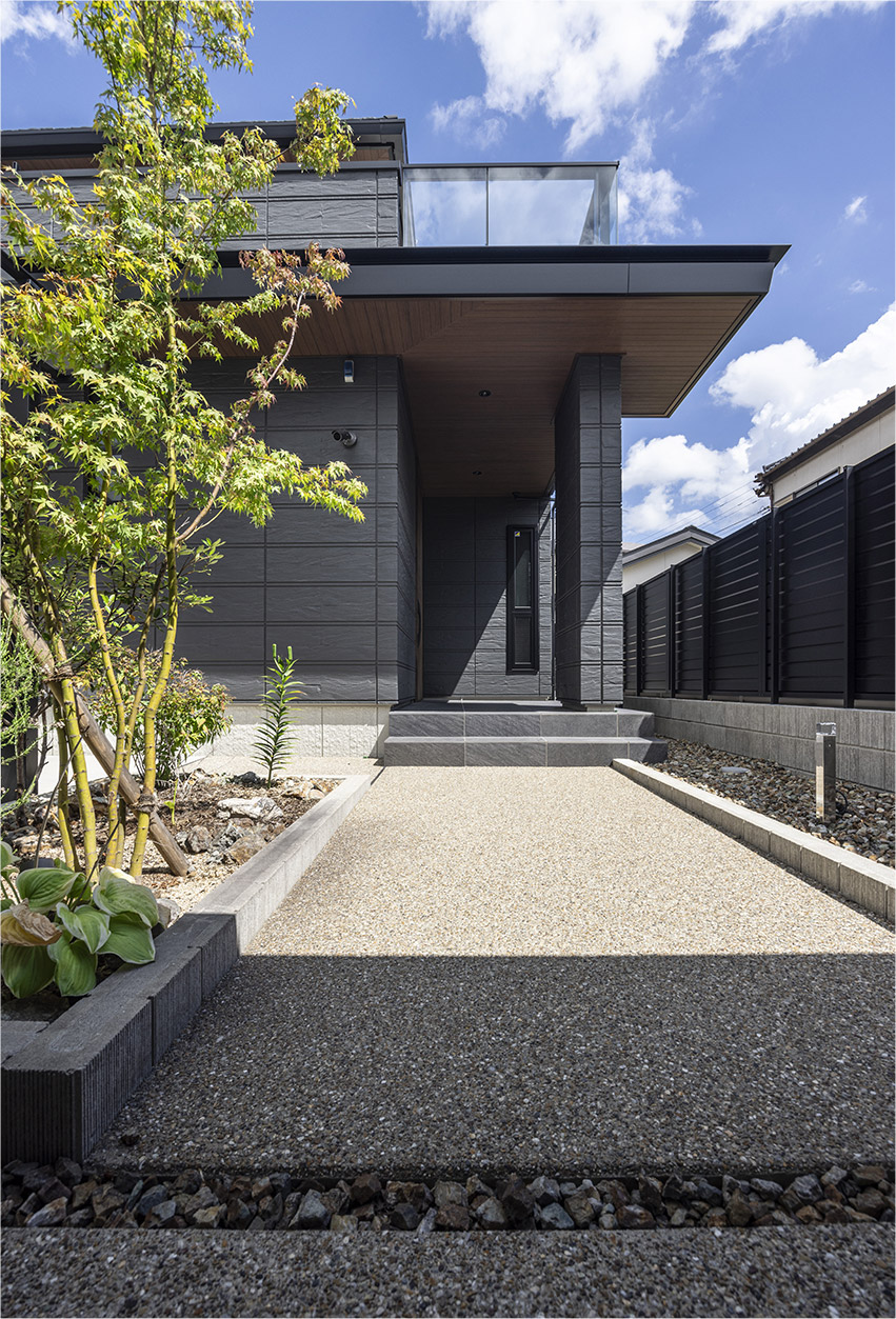 奧行きのある敷地を生かした、期待感の高まるアプローチ。正面に見(jiàn)える玄関ポーチは、深いキャノピー(庇)によって堂々とした雰囲気を演出しています。2階のルーフバルコニーの透明腰壁も、表情豊かな外観をつくるのに一役買(mǎi)っています。