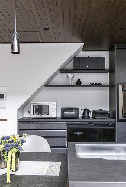 階段下の斜めのラインを生かした「見(jiàn)せる?yún)Ъ{」。カップボードやカウンター、調(diào)理家電や収納用品はすべてモノトーンで揃えてすっきり見(jiàn)せています。