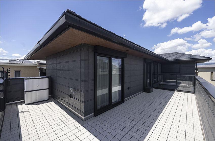 2階の南東面を囲むルーフバルコニー。しっかりと奧行きをとることで、外部からの視線が主寢室まで屆かず、プライバシーを守れます。この広い空間を今後どう活用するか考えるのも、ご夫妻の楽しみの一つなのだとか。