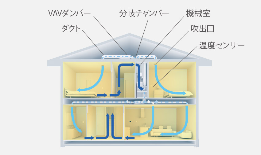夏も冬も部屋間の溫度差が少ない「溫度のバリアフリー化」を実現(xiàn)できるのも大きなポイント。リビングなどの居室はもちろん、外気溫の影響を受けやすい玄関や廊下、洗面室などの非居室、冷気や熱気が溜まりやすい2階まで快適な溫度を保つので、ヒートショックや熱中癥の対策ができます。