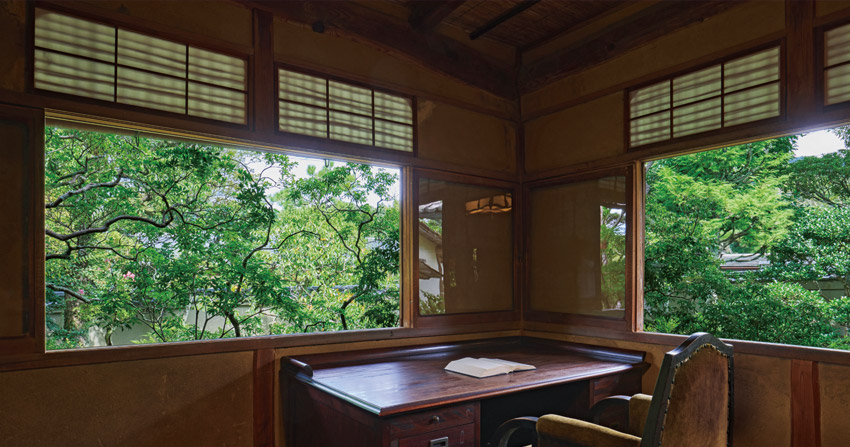 志賀直哉は多くの來客を迎え入れるサロンとして、家族との暮らしを育む場として、そして作品執筆に向き合う仕事場として、この住まいを設計しました。數寄屋風の造りに西洋のアールデコ様式を取り入れた建物には、數々の進歩的で合理的な工夫や、簡潔さを旨とする美的センスを見ることができます。