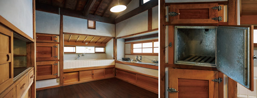 寫真左の食器棚は、食堂側と臺所側の両方から利用できるユニークな仕組み。臺所には最上段に氷を入れて食品を冷やす冷蔵庫も設けられていました。床は関東風の板張りです。