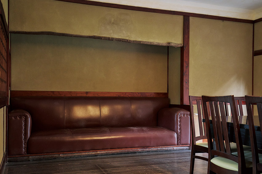 食堂の床の間には、えんじ色の牛革のソファが造り付けられています。