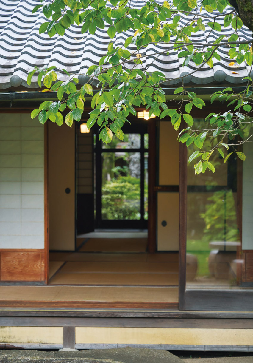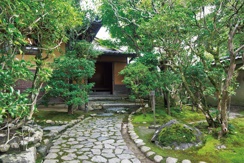 表門を入って石畳の小道を進むと、林のように葉を茂らせる木立の間から玄関が見えてきます