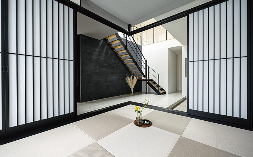 住まいに和の趣を取り入れる際は、現代的なデザインに馴染ませる工夫が必要です。床の間や長押(なげし)、小壁(こかべ)といった和室を構成する要素を省いてすっきりとした佇まいにしたり、住まい全體のデザインやインテリアと調和する素材?色味を選んだり。ライフスタイルに畳が合わなければ、建具をモダンなデザインの障子にしたり、壁面の一部を塗り壁や和紙を用いたアクセントクロスにしたりするだけでも、和の雰囲気を味わえます。