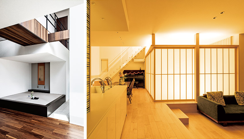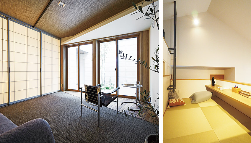 右)スキップフロアを畳敷きにして、座ったり寢転んだりできるくつろぎのスペースに