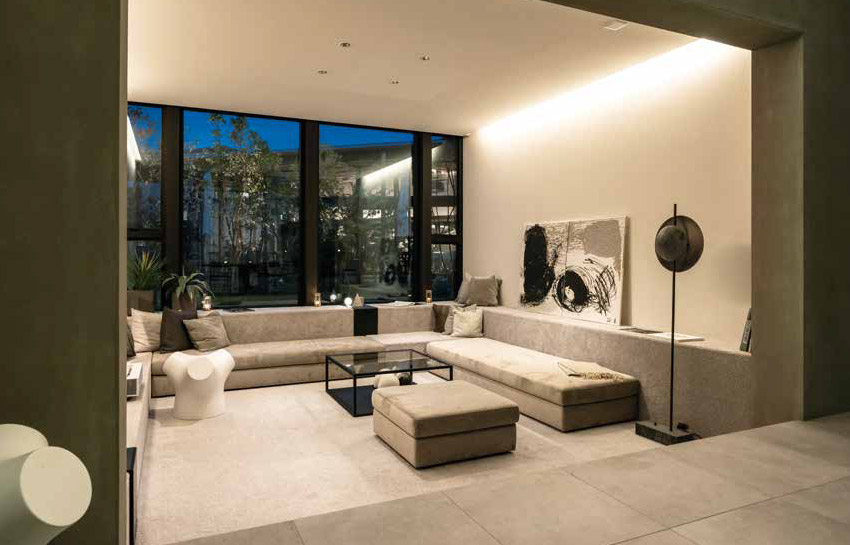間接照明の柔らかな光で満たされたロースタイルリビング