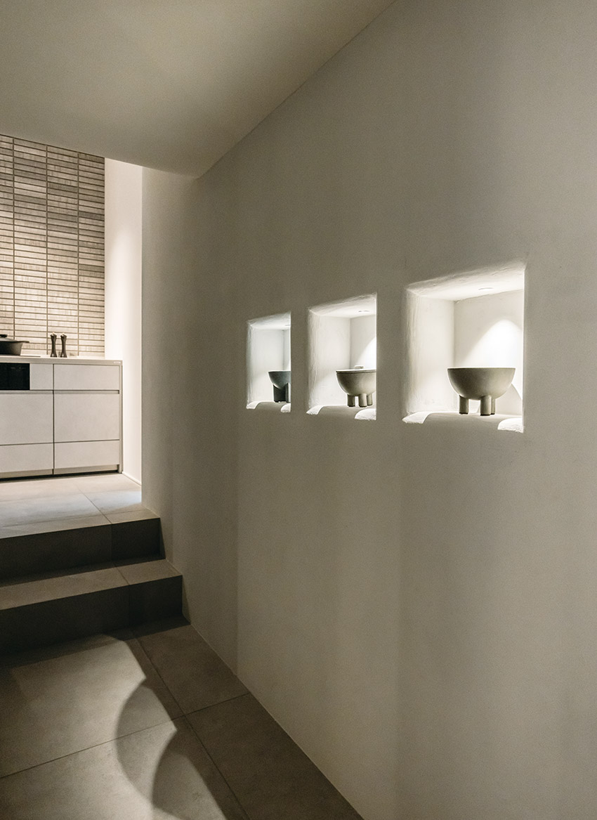 ニッチに飾られた3つのオブジェは、美術館のような照明でドラマチックに