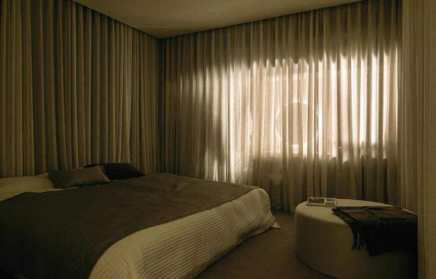 主寢室は間接照明の光を薄地のカーテンで反射させ、柔らかな光を描いて