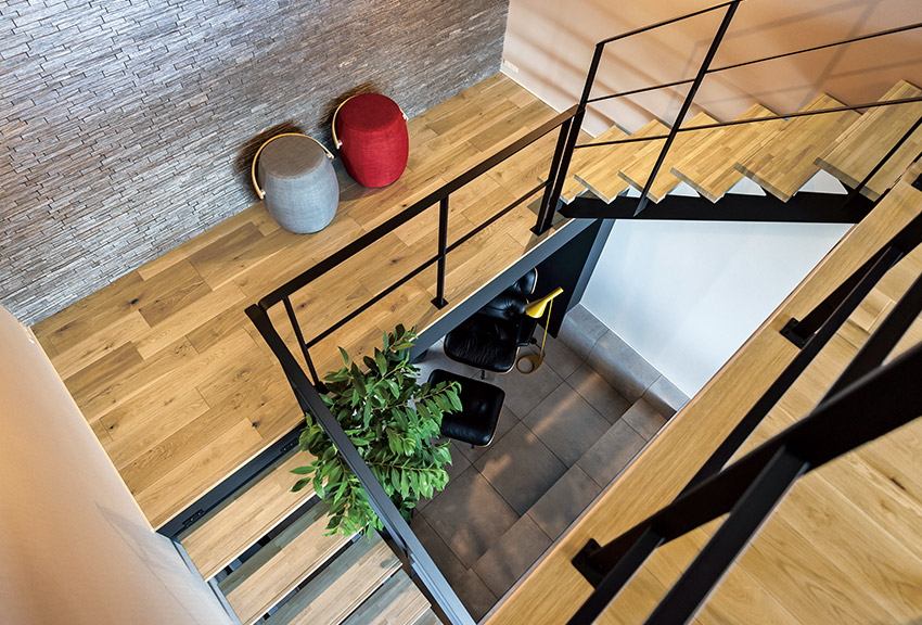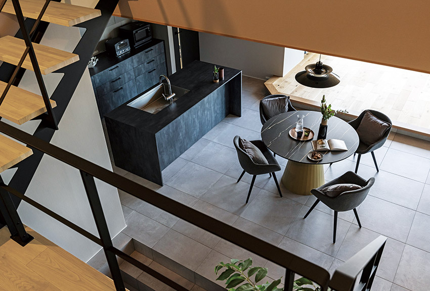 ダイニングから2階へと続く階段は、ダイワハウスの展示場で一目見て気に入ったというスケルトン階段に。アイアンと木の組み合わせが美しく、上質な存在感を放っています。「スキップフロアから、雰囲気の異なる1階と2階を同時に眺めるのも面白い」と直美さん。