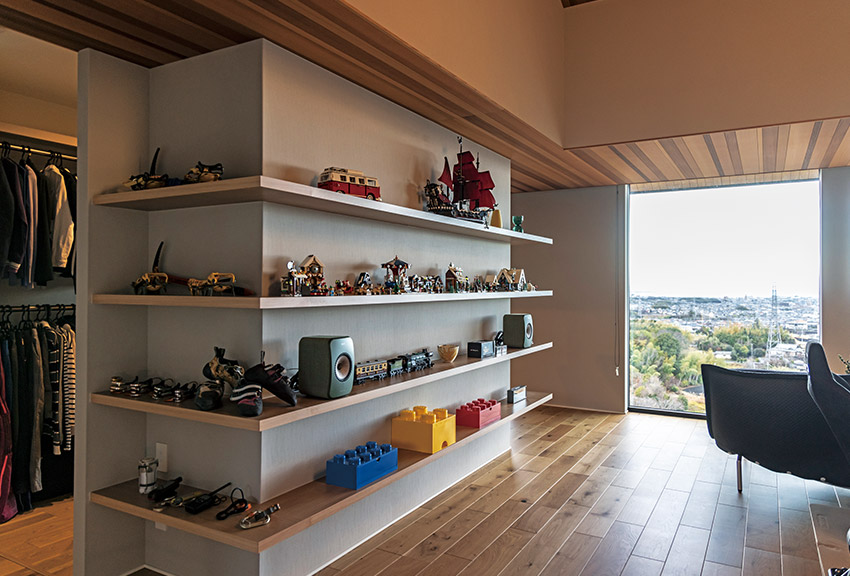 インテリア雑貨やおもちゃのコレクションなどをたくさんお持ちだったYさまは、それらを飾りながらしまえる造作棚をオーダーされました。コの字型にしつらえた棚にはカラフルな小物が並び、2階のホールを楽しく彩っています。