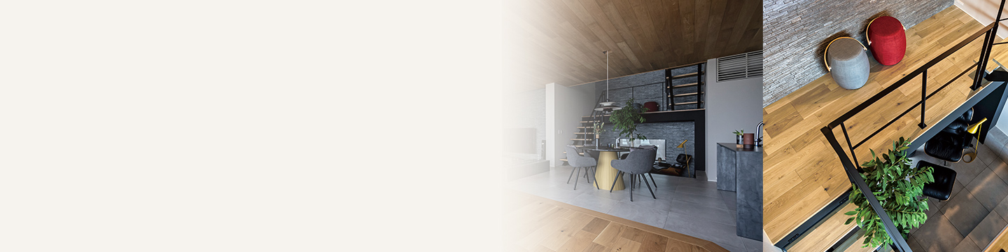 1階の板の間は節目のあるオークを採用し、突き板の素材感を生かしたナチュラルな雰囲気に。天井は落ち著いたイメージにするため、節目のないものを張っています。床にはグレーの大判タイル、リビングや階段後ろのアクセント壁には質感豊かなタイルを選ばれました。さまざまな自然素材が調和した、上質感のある空間をつくりました。