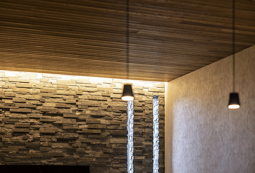 LDKで大切にしたのは、「重みのある照明計畫」。間接照明を活用し、必要な部分に必要な明るさを確保して、心地よく集える雰囲気をつくりました。ダウンライトを極力減らして、天井面をすっきりと美しく見せています。ベンチに設けた2つの球形のライトがポイントに。