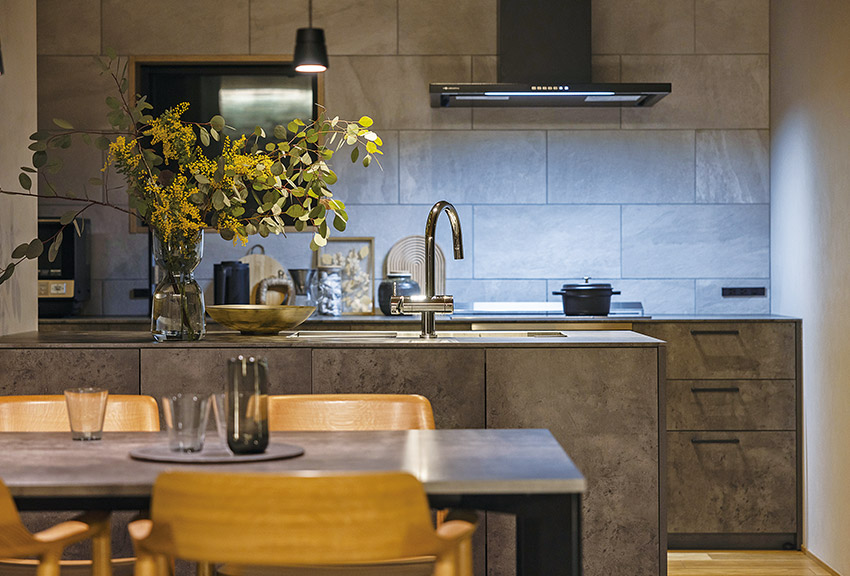 「魅せるキッチンとダイニングは統一感のある素材で」