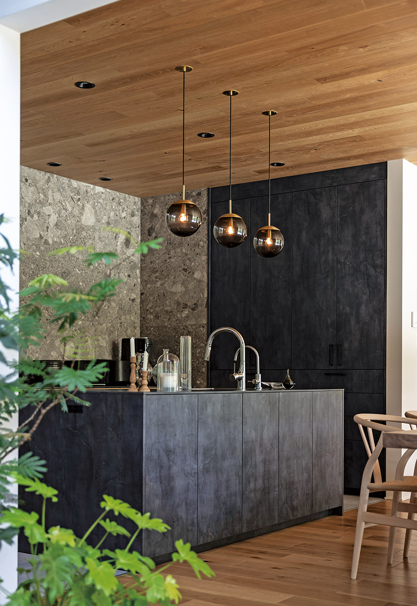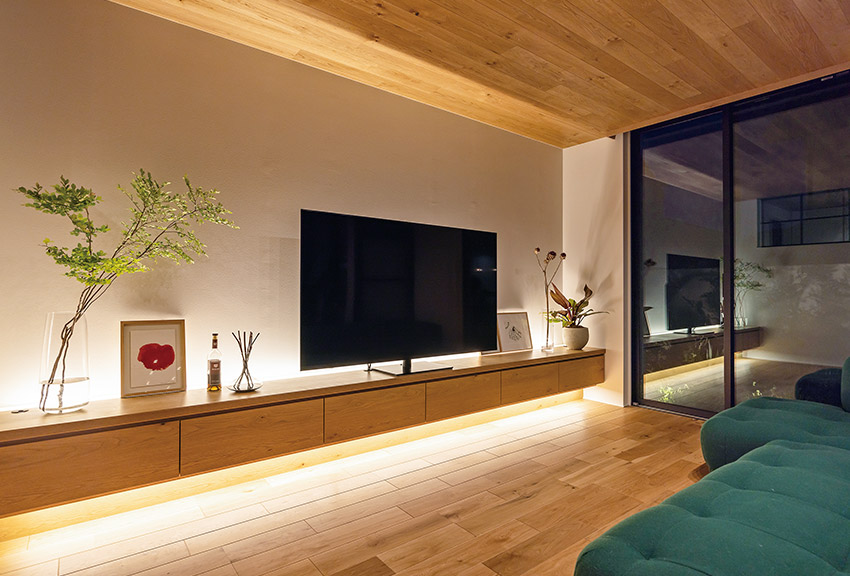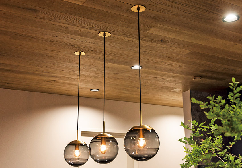 LDKは間接照明を中心とした照明計畫です。キッチン上のペンダントライトは、地元?奈良の照明ブランド?ニューライトポタリーのもの。ハンドメイドのガラスや光源が柔らかい表情を醸し出します。埋め込みにより天井をすっきりさせたのは順子さんのこだわり。