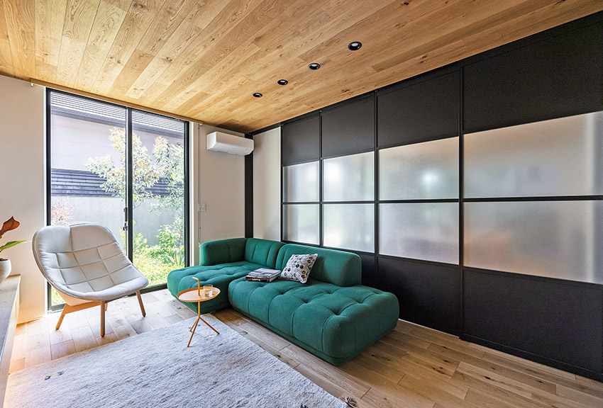 空間を緩やかに分けるパーティションを閉じれば、リビングはLDKから獨立した部屋になります。「將來の親との同居や、私たち夫婦が年齢を重ねた時のために、1階だけで生活できるように考えました」と栄治さん。現在は、家族の留守中に愛犬たちが過ごす場所としても活用されています。