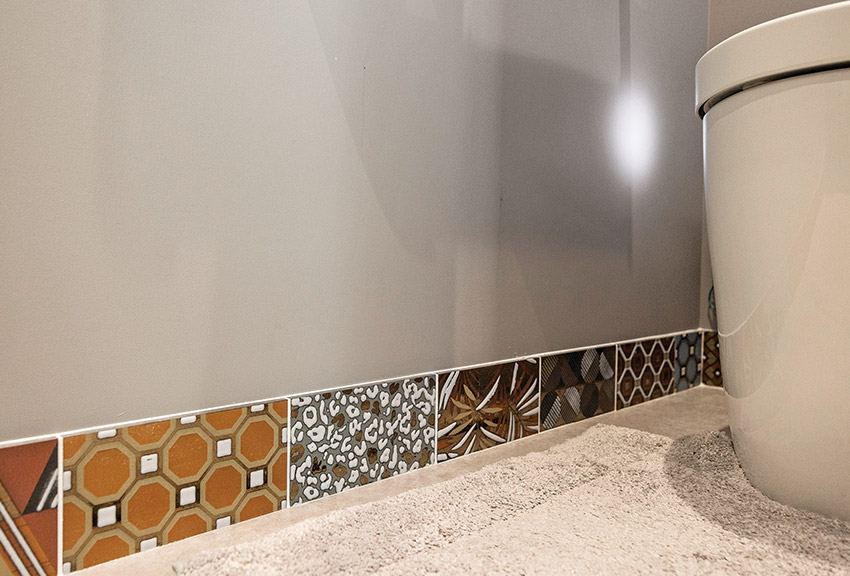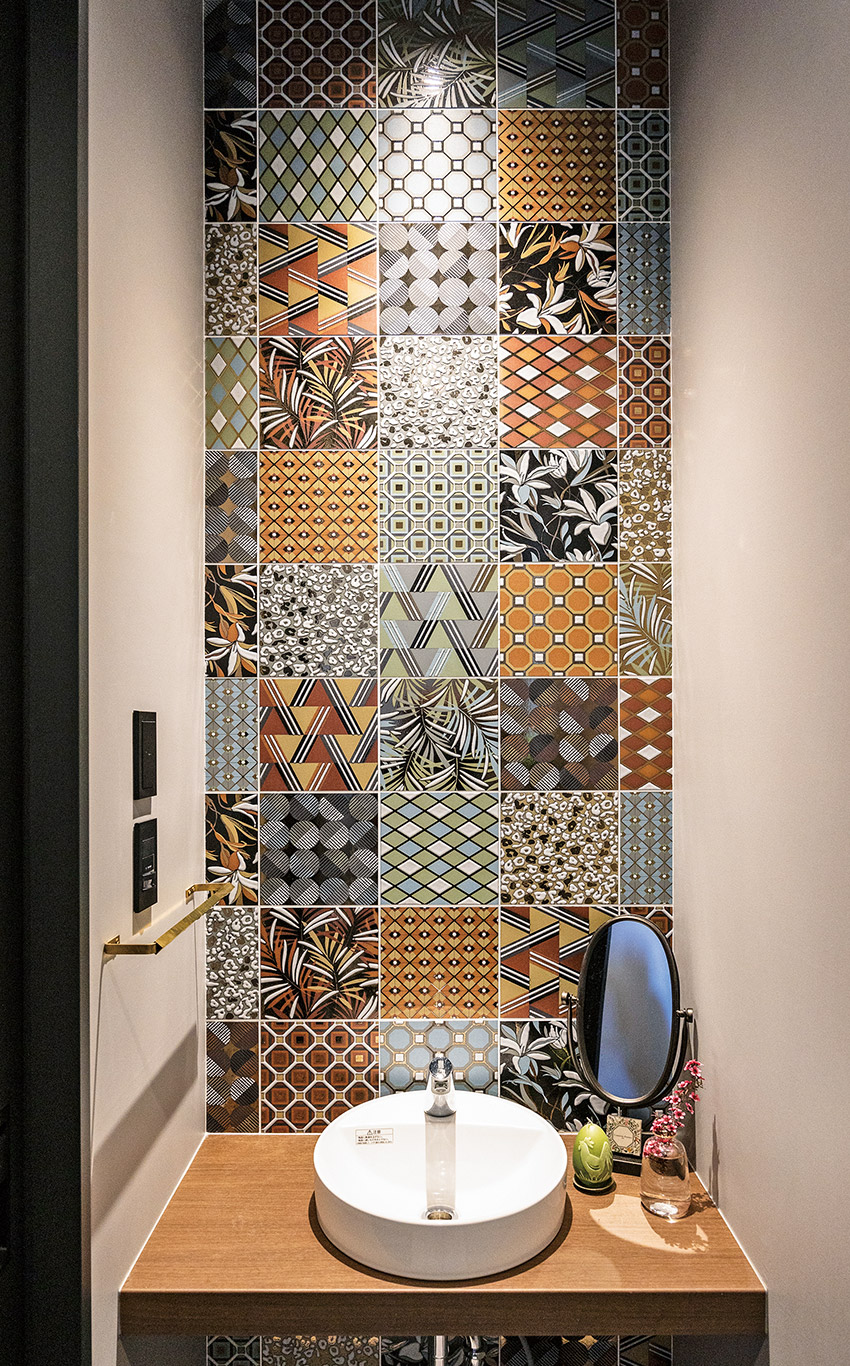 1階のトイレを彩るのは、イタリアのタイルブランドが手掛けるさまざまな模様のタイル。菜々子さんが割り付けを考えたのだとか。余ったタイルを幅木のように壁に張って、Yさま邸だけのデザインに。