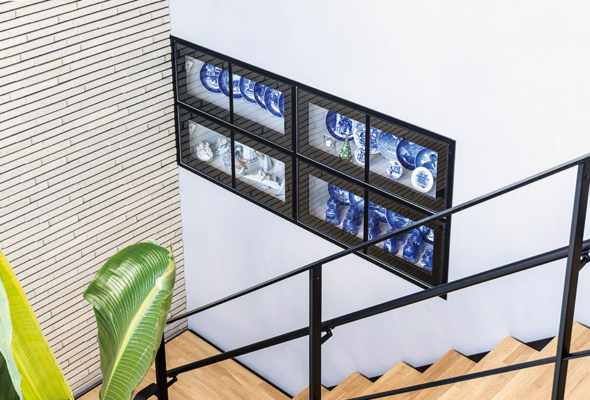 順子さんがコレクションしているイヤープレートや陶器のフィギュアを飾るため、階段の踴り場に見せる収納をつくりました。窓を思わせるデザインは、玄関?リビング間の室內窓のデザインともリンクしています。