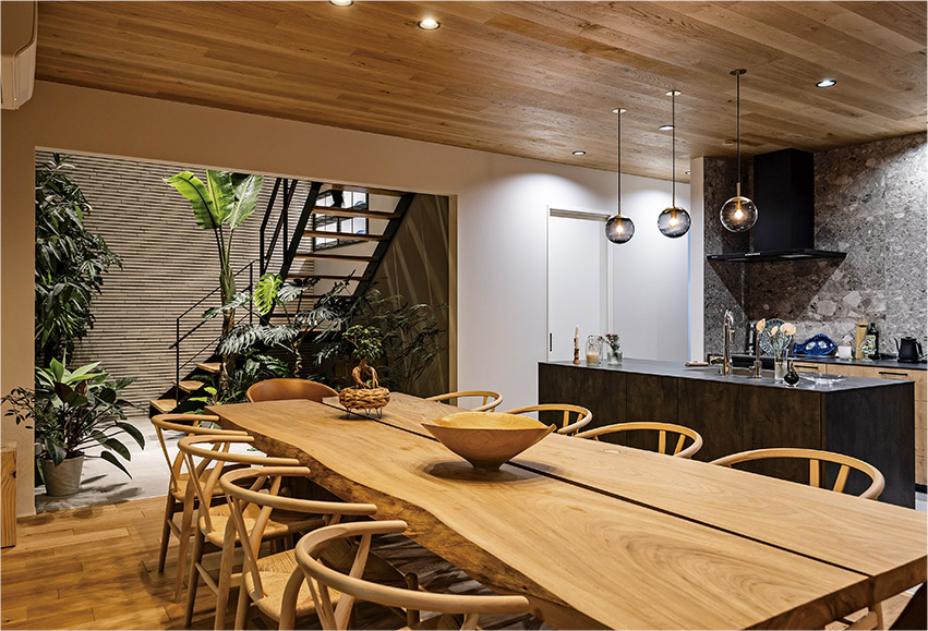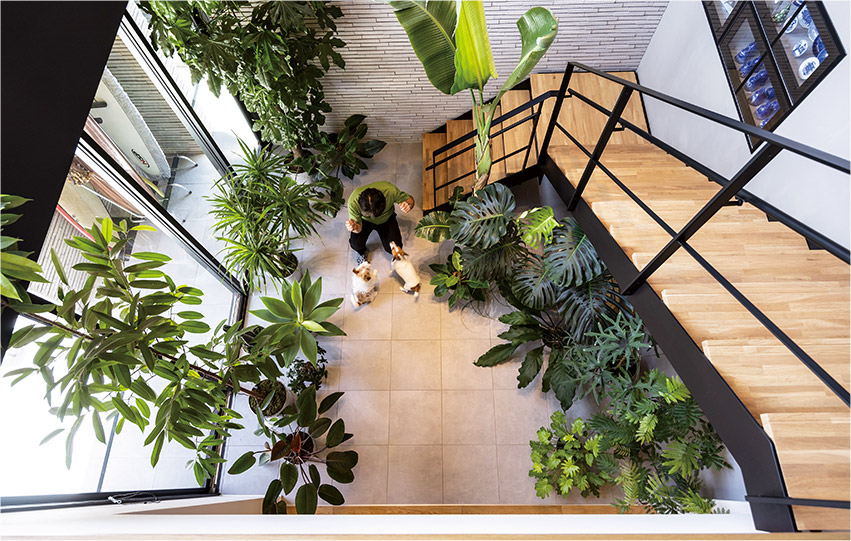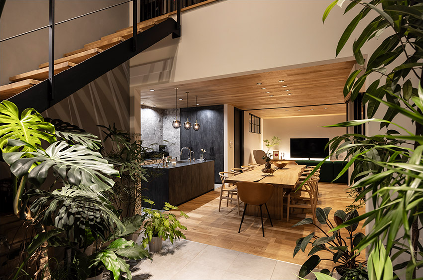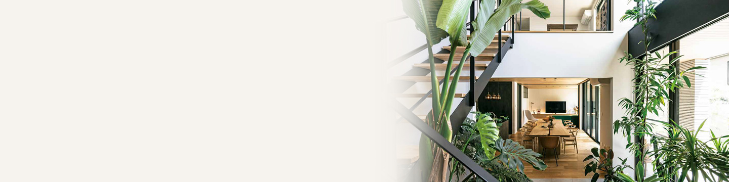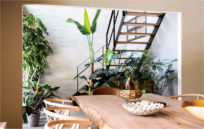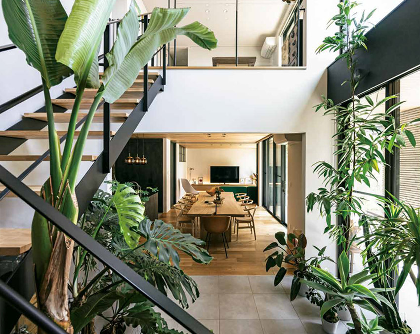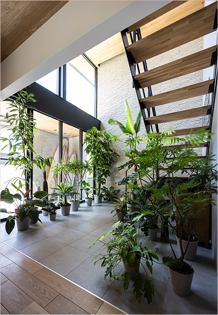 約1年前にこの家を建築されたYさま一家は、夫の栄治さん?妻の順子さんと、現(xiàn)在は東京で暮らす長(zhǎng)男の勇治さん、長(zhǎng)女の菜々子さんの4人家族です。「一番かなえたかったのは、緑に囲まれた生活でした」と順子さん。當(dāng)初は中庭のある家をイメージしていましたが、大和ハウスの設(shè)計(jì)士の提案により、生活の中で折に觸れて緑を眺められるグリーンルームを設(shè)けられました。1階と2階をつなぐ天井高約5.4mの吹き抜けに存在感のある鋼製のスケルトン階段が設(shè)置され、その周囲に大小さまざまな観葉植物が並べられています。どの鉢も南側(cè)から注ぐ太陽の光でいきいきと育ち、ユニークな樹形や美しい葉っぱの姿がご家族の目を楽しませてくれます。日射量や濕度など植物の生育に必要な條件を確保するため、順子さんのお知り合いであるグリーンコーディネーターと設(shè)計(jì)士がタッグを組んで設(shè)計(jì)した、渾身(こんしん)の空間です。