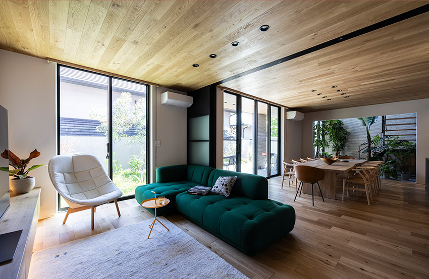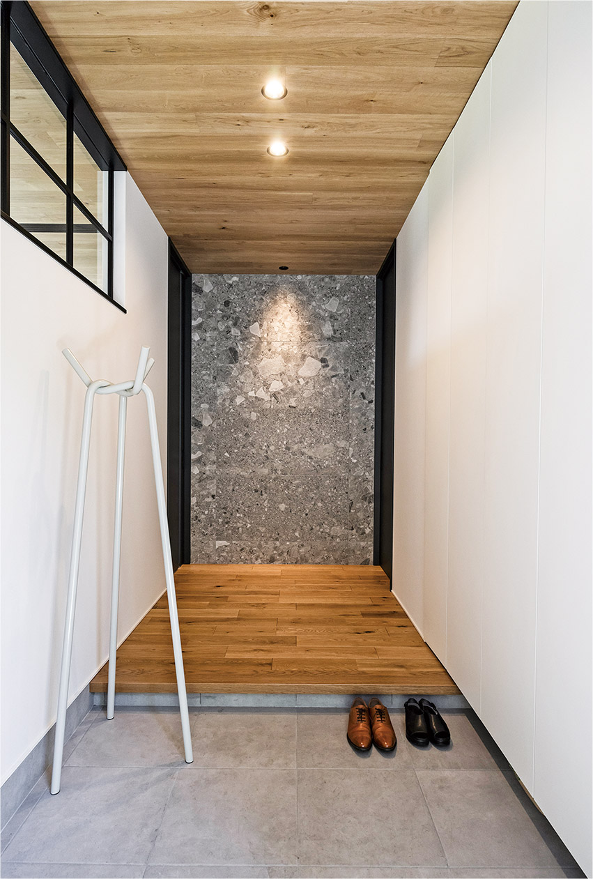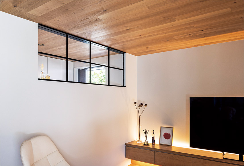 玄関とリビングを室內(nèi)窓でつなぎ、採(cǎi)光に配慮。 木目の天井材を連続させて抜け感を演出しました