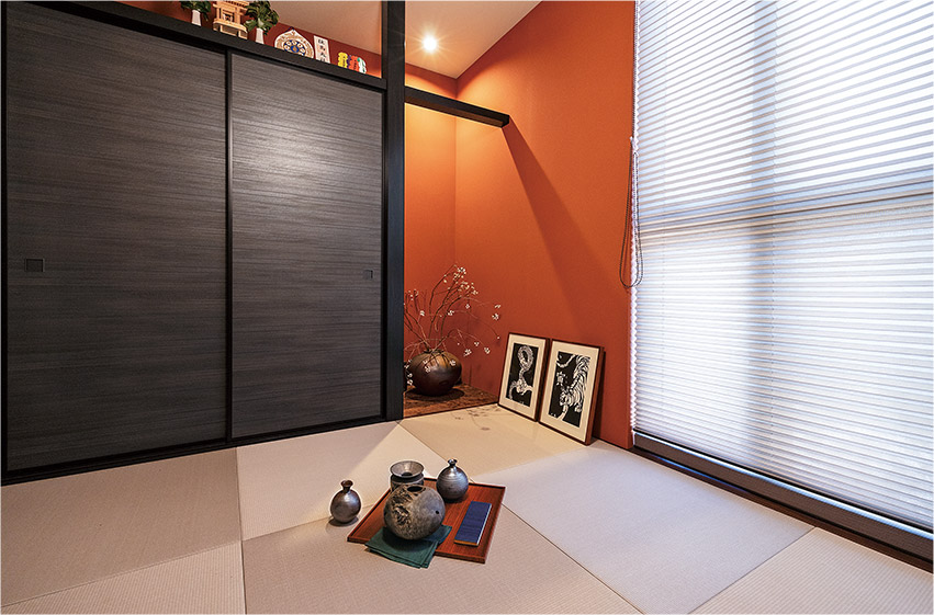 朱色の壁紙がモダンな和室には、ゲストが泊まることも。押入の天井部分が抜けたデザインによって圧迫感を抑えています