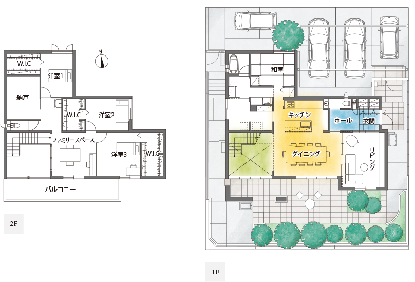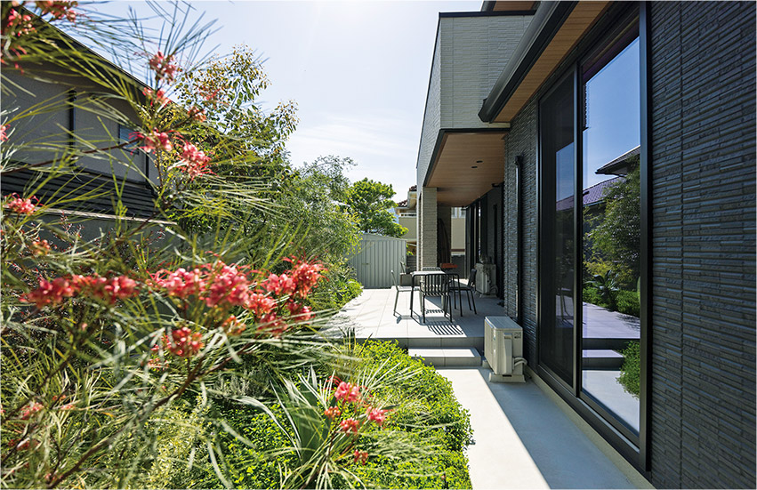 手前の「見て楽しむ庭」、「外に出て楽しむ庭(テラス)」、倉(cāng)庫(kù)を備えた「実用の庭」。3つの庭を暮らしに合わせて活用しています