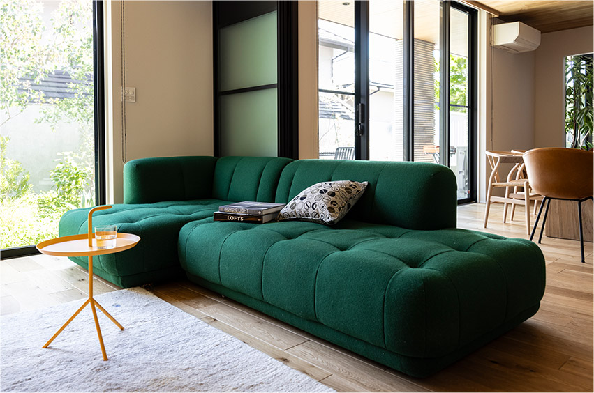 緑が鮮やかなリビングのソファと、黃色がかわいらしいコーヒーテーブルは北歐の家具ブランドHAYのもの。3mを超える一枚板のダイニングテーブルは、ご夫妻が木材店の主とともにこだわり抜いて選んだ逸品
