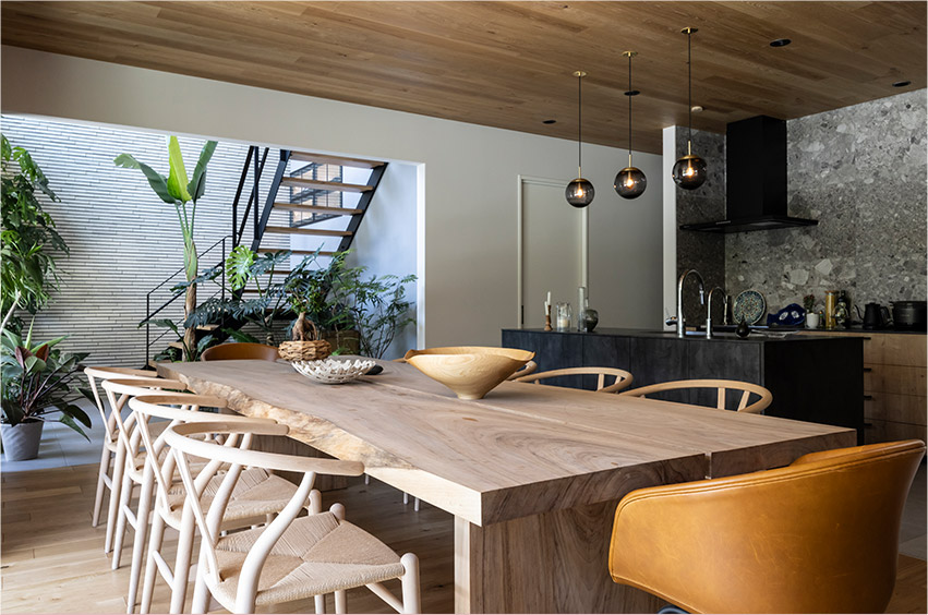 3mを超える一枚板のテーブルは迫力たっぷり。明るすぎないしっとりとした食の空間が、そこに集う人々の心を結(jié)びます