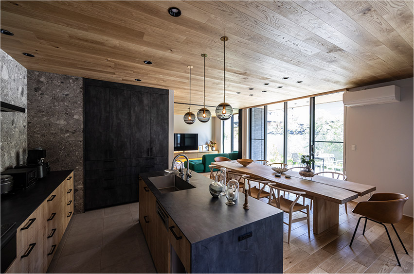 LDK空間の中で、上質(zhì)な家具のように存在感を放つシステムキッチン。ご家族で訪れたキッチンハウスのショールームで一目ぼれしたそう。隣の食品庫(kù)に冷蔵庫(kù)や買い置きの食品類などをまとめることで、すっきりとした美観を保っています