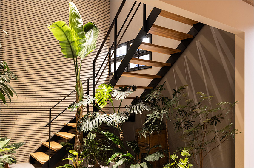 植物たちが晝間とは違う表情を見せる、夜のグリーンルーム。鋼製のスケルトン階段がグレーの塗り壁にきれいな影を落とします