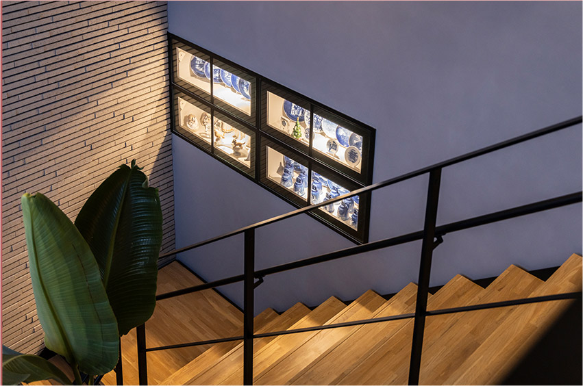 夜は「見せる?yún)Ъ{」もライトアップ。イヤープレートや陶製フィギュアのコレクションをより美しく演出します。グレーの塗り壁の質(zhì)感もしっとりと