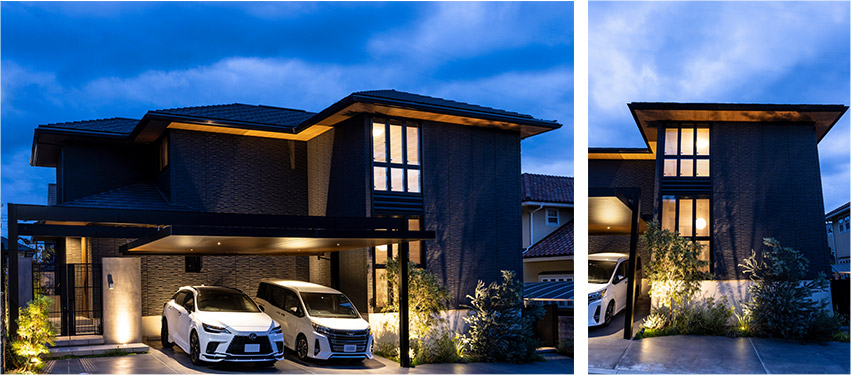 ライトアップされたYさま邸は、幻想的な趣をたたえて街のランドマークのよう。1?2階に連続する窓が特徴的なデザインです